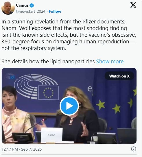 And, Pfizer knew it. As it turns out, even though Pfizer censored the MRNA vax research papers into oblivion, the ONLY thing what they handed over had in it was research into how the shot made rats infertile, there was nothing in it about curing a respiratory infection AT ALL, other than the title. Obviously, Twitter is the only place that will allow this bust by Naiomi Wolf, delivered at the UN, to be posted.
